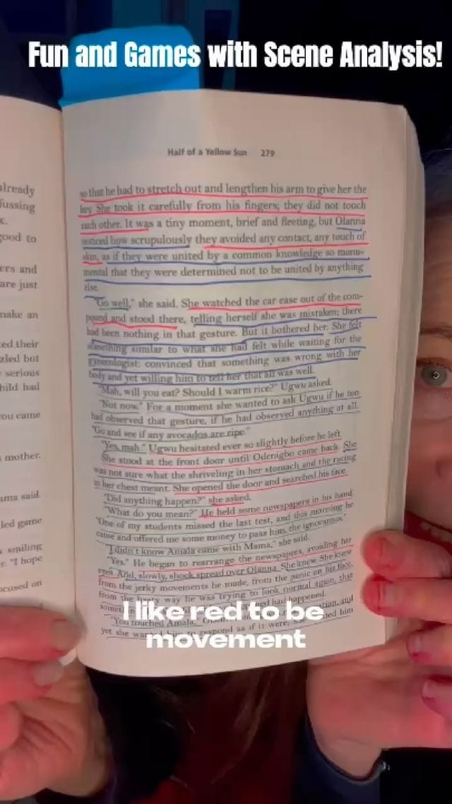 In my latest blog post, I analyze a scene from Chimamanda Ngozi Adichie’s Half of a Yellow Sun, underlining the sentences that convey action or movement in red ink, and the scenes that convey interiority in blue; dialogue was underlined in green. The scene in question happens right after the protagonist Olanna––a member of Nigeria’s elite––has married her long-time boyfriend Odenigbo, a Univeristy professor. Odenigbo’s mother has a maid named Amala. Olanna has just returned from London, and while she was gone, Odenigbo slept with Amala. (The reader knows this from the previous chapter, which was narrated from the perspective of Ugwu, Odenigbo’s houseboy—he saw Amala come out of Odenigbo’s bedroom in a loose wrapper and a guilty expression.)