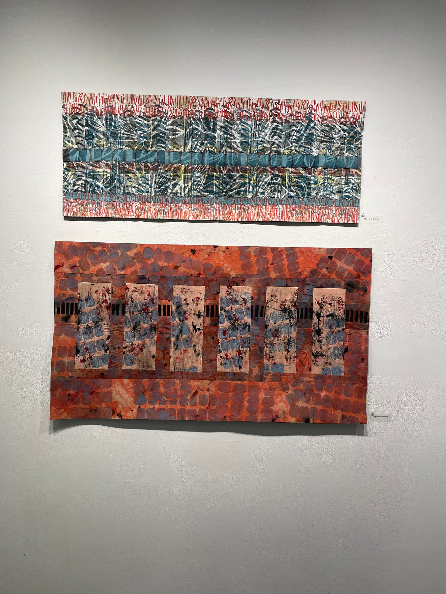 Tom and I had the great fortune to catch Cheryl’s show at Gallery A3 in Amherst before it closed. Cheryl has written a memoir about her experience caring for her mother and husband as they each suffered with dementia, and because she is a brilliant textile artist as well as a brilliant writer, she captured the experience through a series she named The Dance of Dementia. Here is a photo I took from the show: