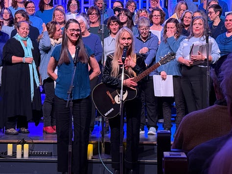 And yet. Somehow, even without all the caffeinated striving, I do manage to get some things done. This past fall turned out to be one of the happiest and productive of my life. Katryna and I started our Welcome Table Chorus, and we’re now on our second session, with enrollment over 90 singers. Our final Fall concert at the Bombyx raised over $3400 for the Food Bank of Western MA. (You can watch that here! Scroll to minute 16—there’s a lot of dead space in the video). I chaired 30 Poems in November, sending out prompts daily and writing a poem or a song a day myself. The fundraiser for Center for New Americans was a huge success—we raised over $100,000. I wrote several new songs, including “Bang Bang,” which we will sing at the Iron Horse on February 7. Our own shows have been very well-attended (I’ve managed to perform OK uncaffeinated), and during our recent tour opening for Dar Williams, every show was sold out. I still do my PT every day for my chronically weak shoulders and upper back, and every day I go for a walk.