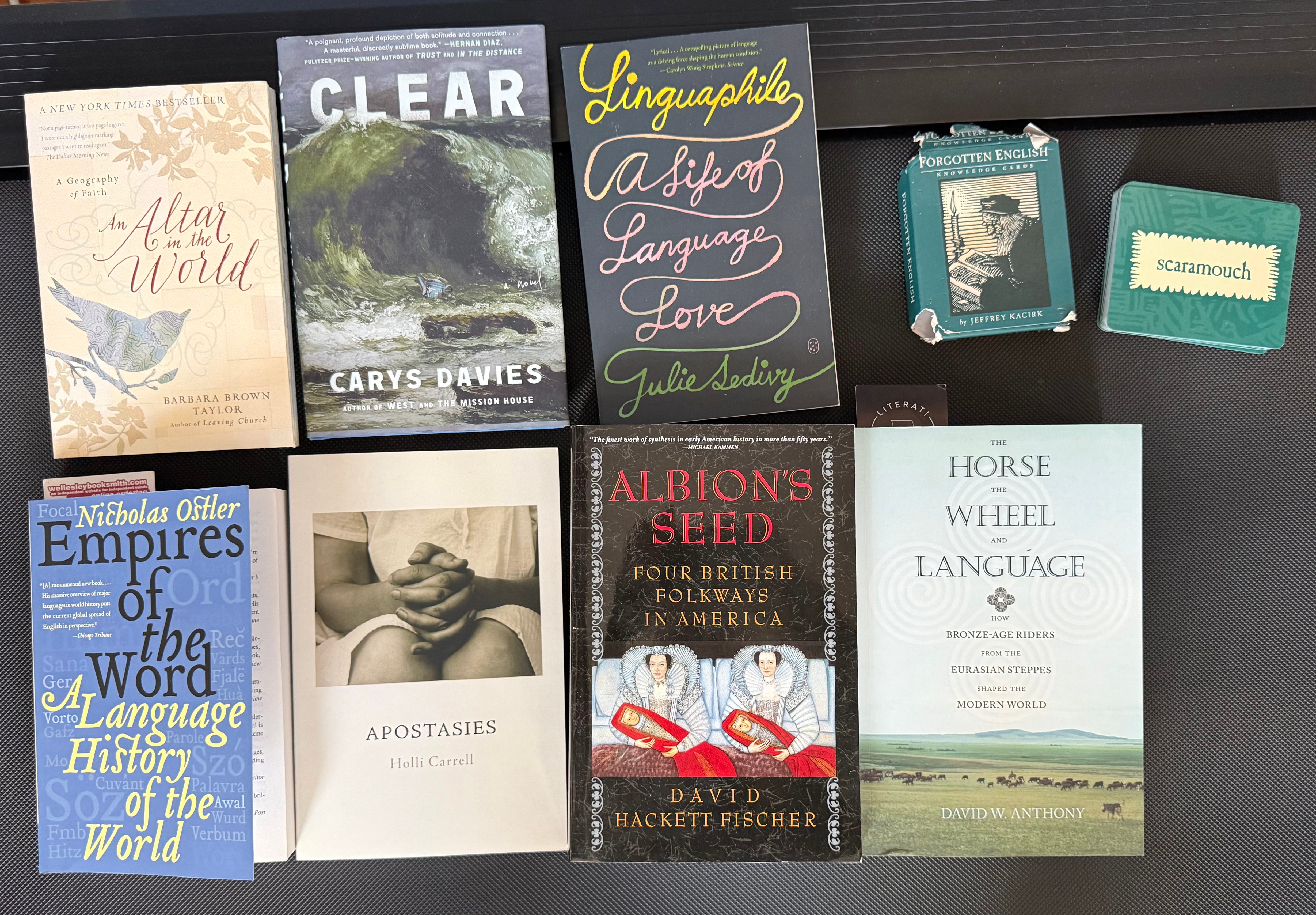 My family has been paying attention to my insane fascination with words, etymology, language families. Not pictured: Skippy Dies by Paul Murray, my last read of 2025 and SO GOOD that I kissed the book when I finished it.